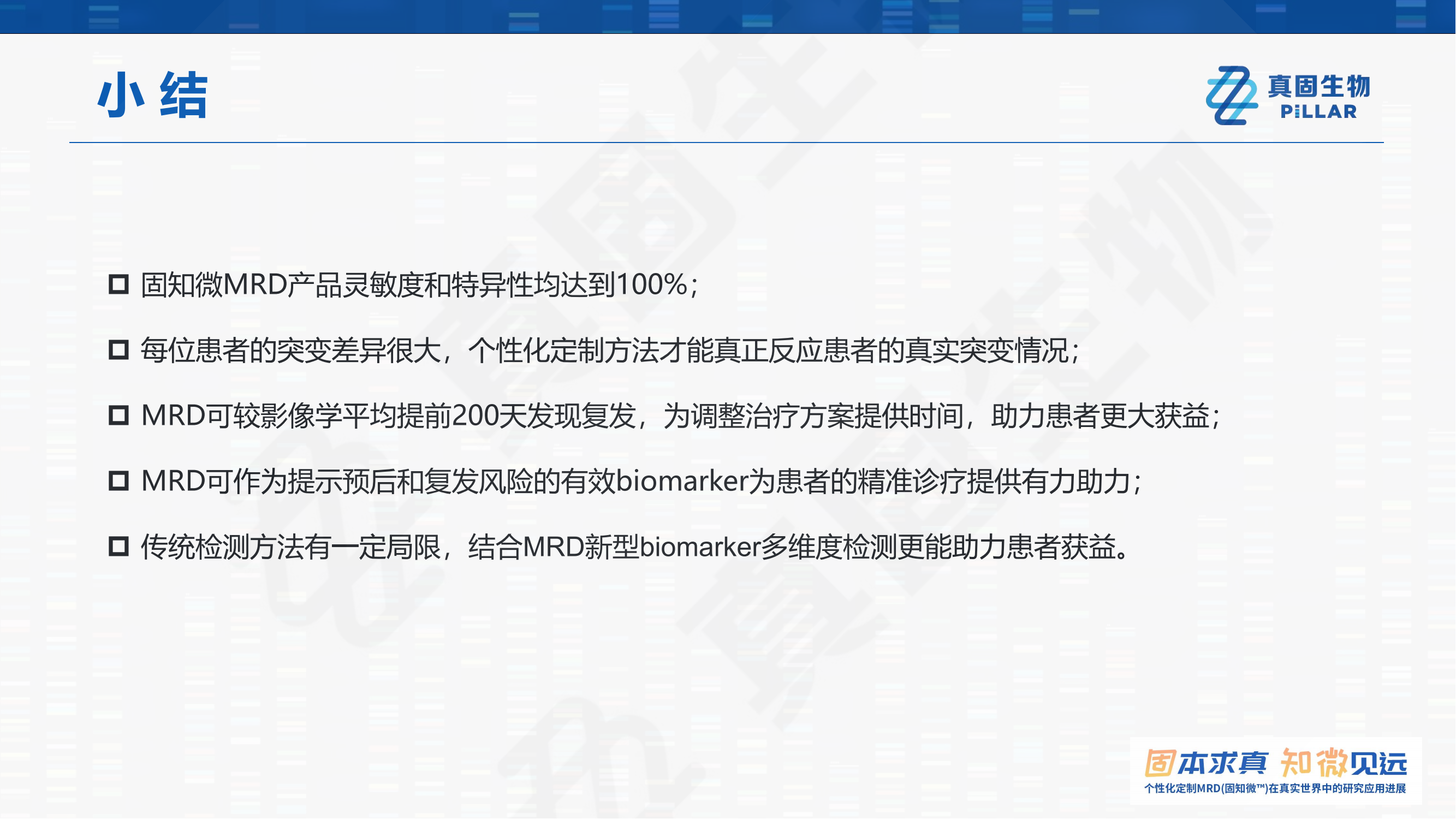 报告最后,冯教授也就MRD在临床应用层面存在的一些问题和需求做出了展望,相信随着越来越多类似真固生物这样以产品为核心、临床价值为导向的诊断公司参与进来,MRD在临床的实际应用会越来越成熟,最终使患者获益。