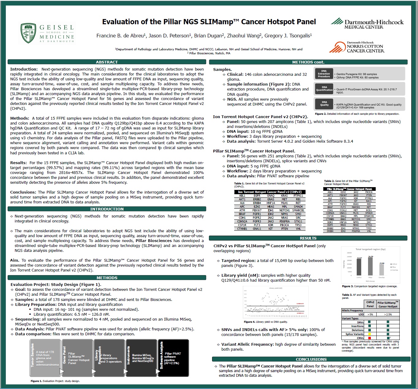 - This poster was presented at the Association for Molecular Pathology 2016 conference held in Charlotte, NC and compared the performance of the Pillar Biosciences’ Lung and Colon Panel on an Illumina MiSeq™ to the Thermo Fisher Ampliseq™ Cancer Hotspot Panel v2 on the Ion Torrent PGM™. 15 previously-characterized FFPE samples found a high degree of concordance (90.0%, 27/30 variants), and the Pillar Biosciences’ assay was shown to be highly reproducible at 5 ng and 50 ng input DNA. Allele frequency measurement reproducibility was also evaluated. J. Peterson, F. Blumental de Abreu, Z. Wang, W. Wells, G. Tsongalis, “Evaluation of the Pillar NGS SLIMamp Lung and Colon Hot Spots Panel”. Dartmouth-Hitchcock Medical Center, Lebanon, NH; Pillar Biosciences, Natick, MA